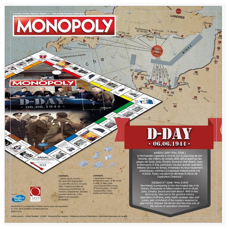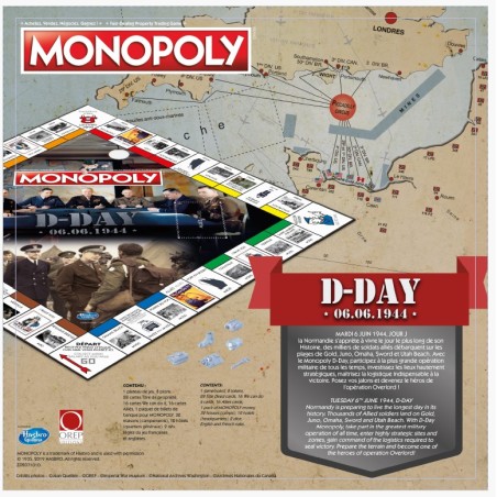 1 Board, 6 counters, 28 property deeds, 16 We Can Do it! cards, 16 Allied cards, 1 pack of Monopoly banknotes, 32 encampments, 12 headquarters, 2 dice, English and French rules.