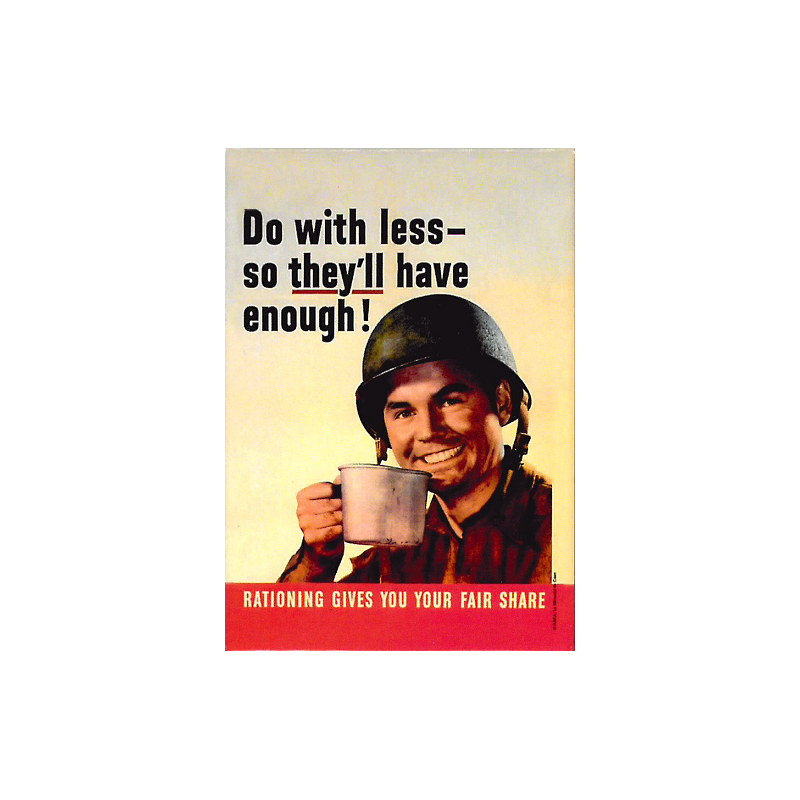 «Do with less so they'll have enough » est une affiche de propagande américaine réalisée en 1943. Pour encourager l'effort de guerre, ce sympathique "GI Joe" en appelle aux familles ayant des fils au front. L'homme représenté est le soldat Thomas J. Murray, décédé en 2002 à l'âge de 87 ans, dont le visage a servi a promouvoir le rationnement de 1943-1945 à travers cette affiche.