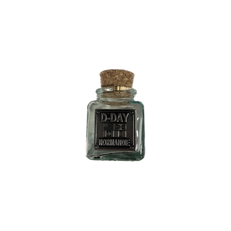 Mini-pot carré en verre avec une plaque en étain et une inscription D-Day.